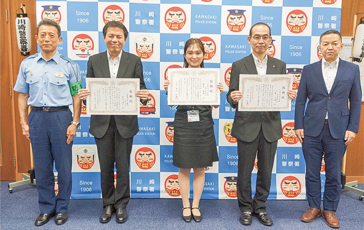 川崎警察署(青山利史署長)は10月15日、特殊詐欺被害を未然に防いだとして、三菱UFJ銀行川崎支店の井上清乃さん、川崎信用金庫本店営業部の鈴木麗華さん、同金庫本店営業部の八巻正博さんに感謝状を贈呈した。