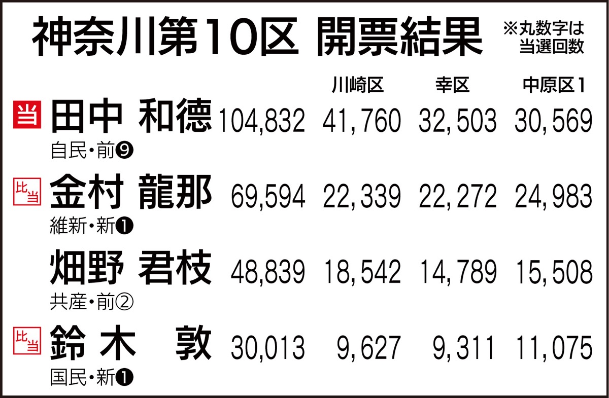 第49回衆議院議員総選挙が10月31日に投開票され、神奈川10区(川崎区・幸区・中原区の一部)は、自民党前職の田中和徳氏(72)が9回目の当選を果たした。日本維新の会新人の金村龍那氏(42)、国民民主党新人の鈴木敦氏(32)は比例復活で当選。一方、共産党前職の畑野君枝氏(64)の議席獲得はならなかった。