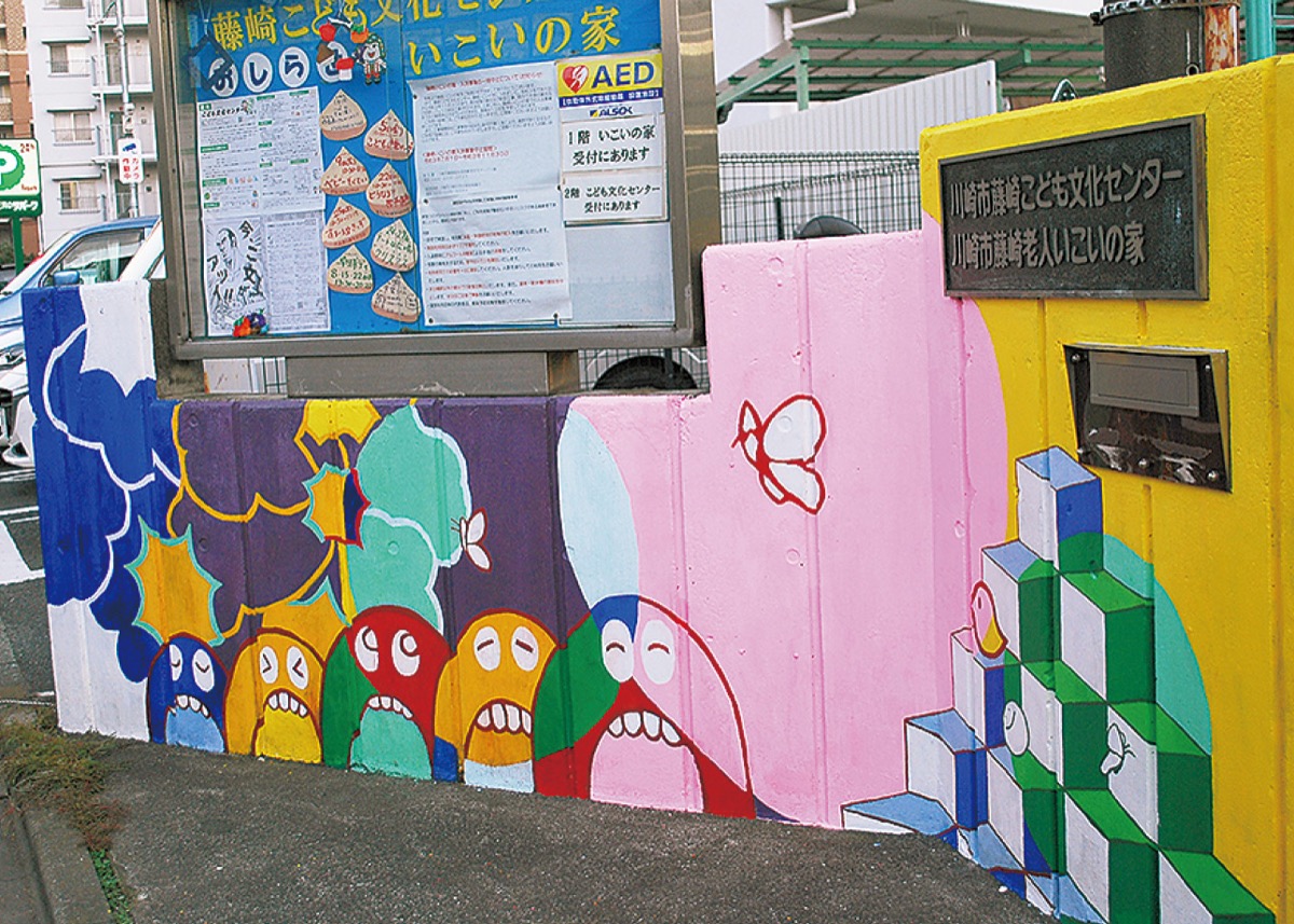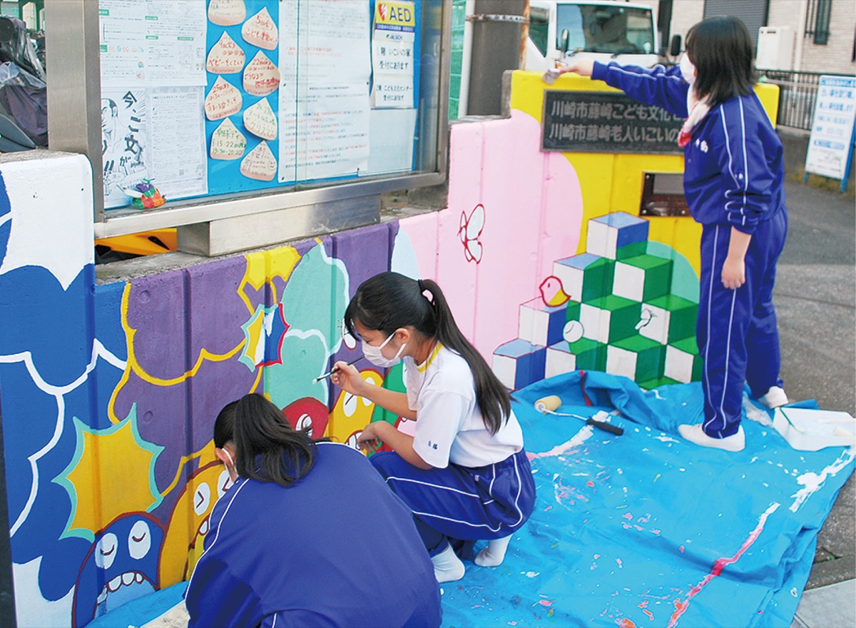 壁画制作の目的の一つは、同センターの存在の周知。担当した榎本佳世子さんは「奥まっていて場所も分かりづらい。まずは知ってもらうこと」と話す。センターの利用は0歳から18歳までが対象だが、利用者の多くは小学生以下。自分たちも使えることを知らない中学生も多いという。「待ち合わせや勉強など、自由に使える居場所があることを知ってほしい」と榎本さん。同センターの岩井智美さんは「制作を通して職員と住民、中学生などたくさんの方との交流が生まれた」といい、今後も地域と連携した取り組みを進めていきたいと展望を語った。