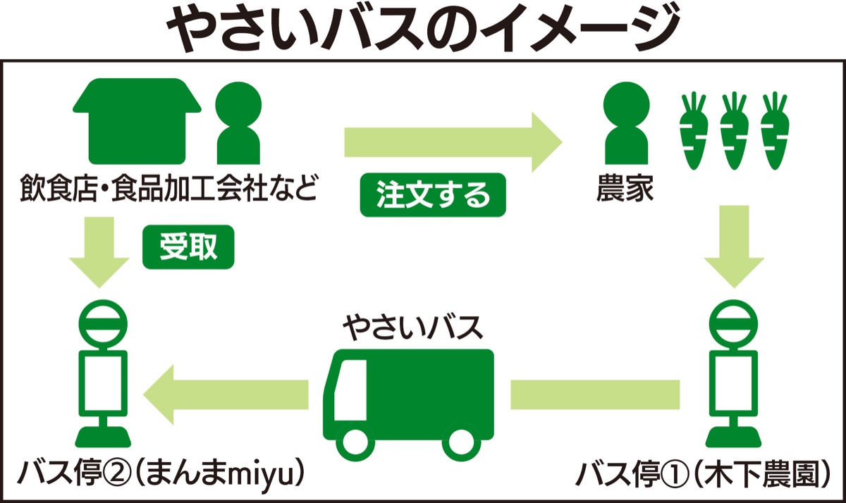 やさいバスは、生産者がアプリを通して飲食店や食品加工会社などから注文を受け、近隣のバス停に野菜を持ち込む。各所を巡回する専用トラックが運び、注文者が近隣のバス停で受け取る仕組み。販売額の15%がシステム使用料として農家の負担となるが、配送コストや廃棄量削減、販路拡大などにつながるメリットがある。消費者側は、コンテナ代1箱350円がかかるが、入荷のために遠方まで足を運ぶ手間がなくなり、新鮮な地場産野菜が手に入る。