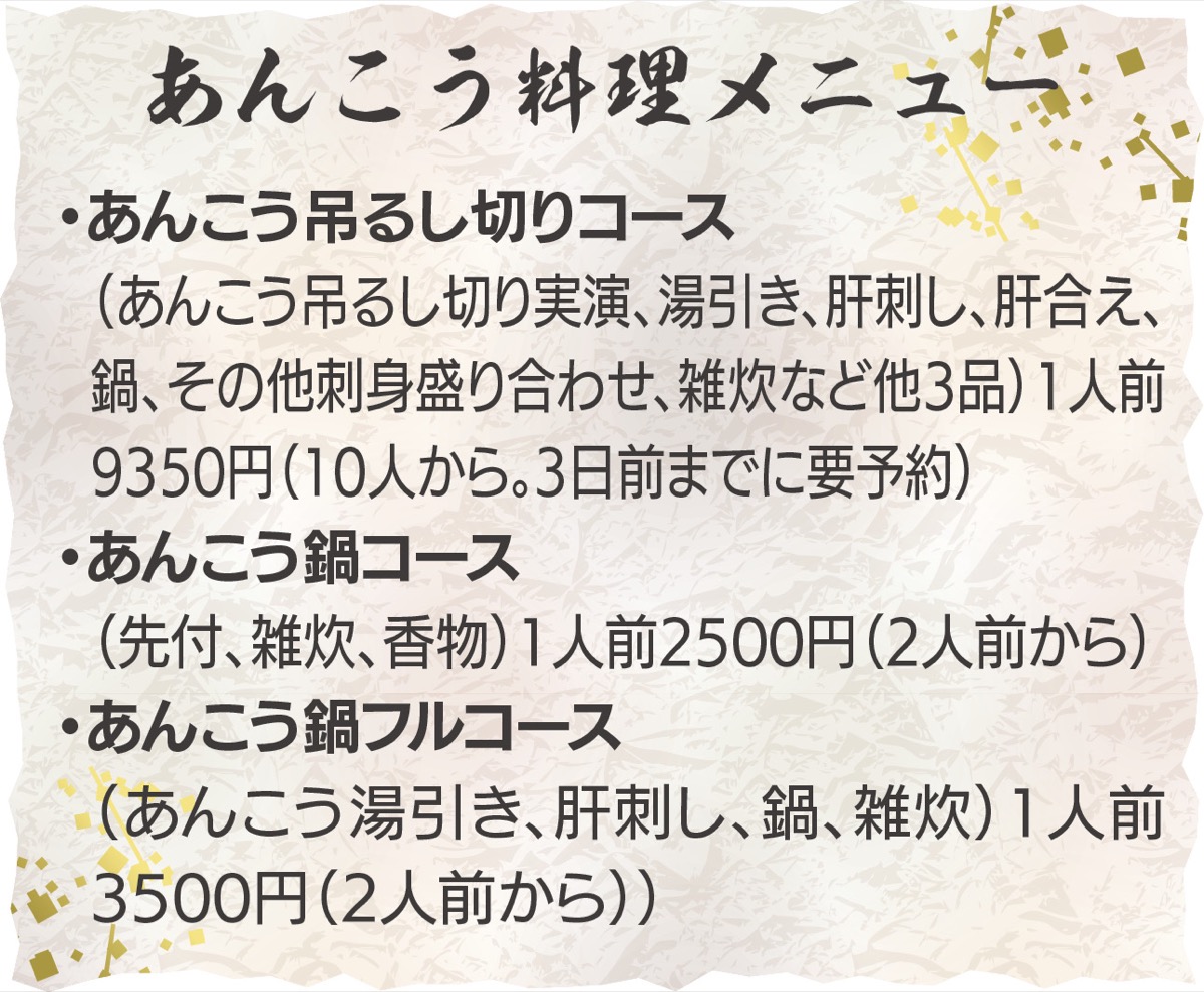 冬の宴会料理と言えば鍋。とんかつ割烹こしばでは12月からあんこう鍋がスタート。他ではなかなかお目にかかれない「あんこう吊るし切りコース」がおすすめ。目の前でさばかれる実演を見ながら、スーパーで売っているあんこうでは食せない、刺身、肝合えをはじめ、鶏肉のような食感のほほ肉、身の部分のソテーなどが楽しめる。10人から3日前までに要予約。