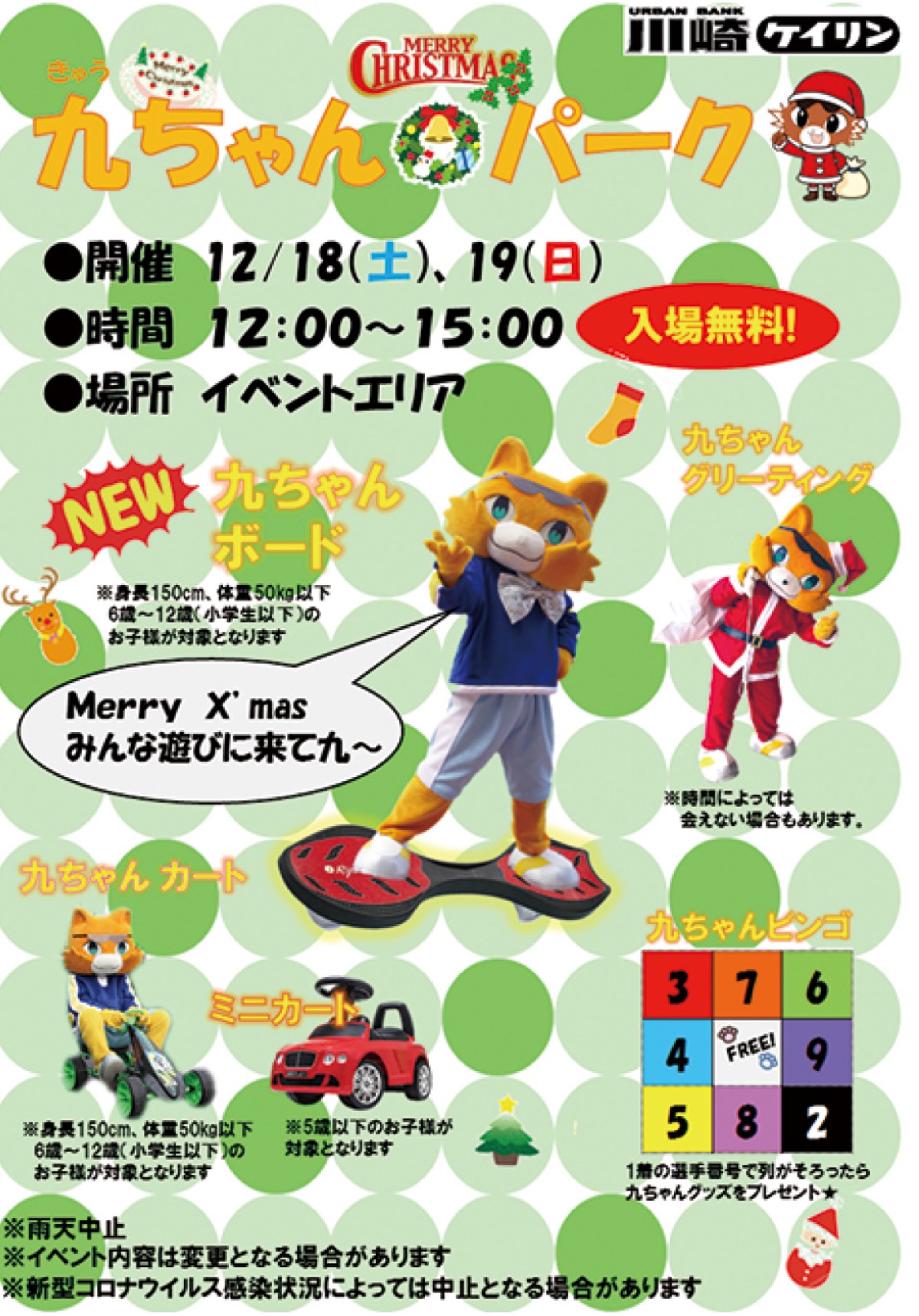 あす18日(土)、19日(日)には小学生以下の子どもたちが楽しめる「九ちゃんパーク」をイベントスペースに開設。ブレイブボードやカートを貸し出し、コース内を自由に遊ぶことができる。「九ちゃんビンゴ」やサンタクロース姿の九ちゃんとの記念撮影の機会もある。時間は正午から午後3時まで。