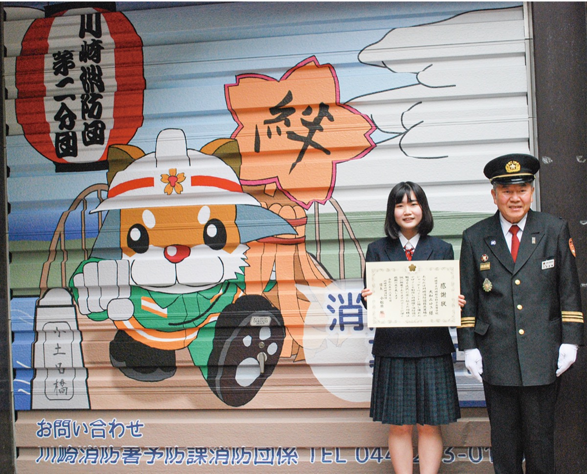 川崎消防団第2分団器具置場(川崎区砂子2の10の6)のシャッターデザインがこのほど新調された。12月7日には図案制作を担当した川崎総合科学高校大和みゆきさん(2年)に、川崎消防団長の小松原徹さんから感謝状が贈られた。
