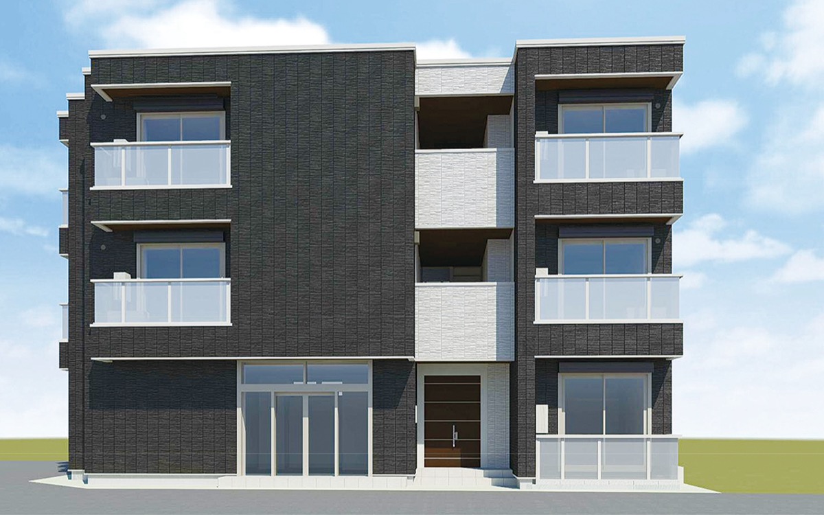 随所にアクセントクロスを施した上質なデザインや空間を体感できる重量鉄骨造3階建てマンションです。1階店舗には、石川商事のリフォーム部が入り、5月オープンの予定となっております。