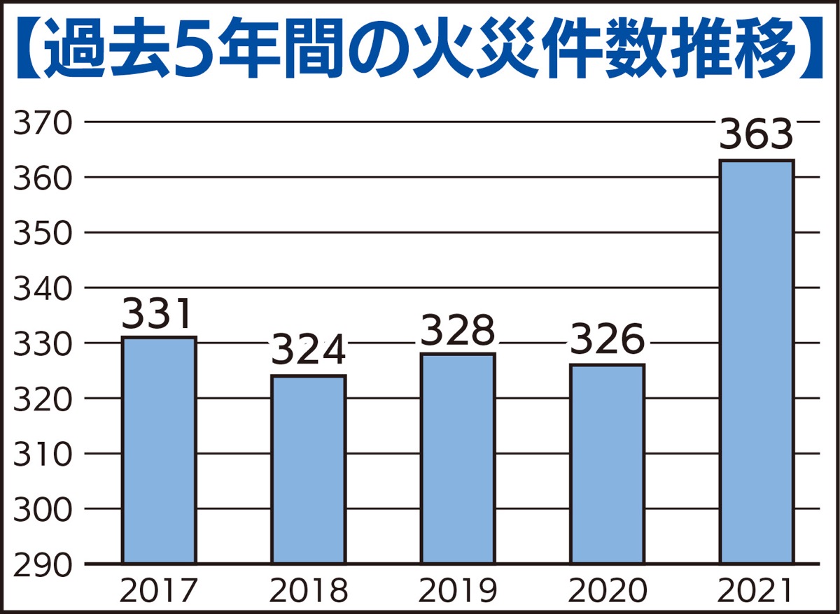 川崎市は1月6日、2021年の火災の概況(速報値)を発表。市内の火災件数が前年比37件増加し、過去5年で最多の363件となった。川崎区内では103件、幸区は37件となっている。
