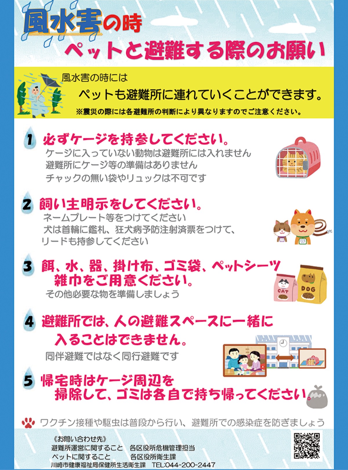 令和元年東日本台風において、ペットの同行避難は可能であったものの周知不足によりペットを理由に避難所利用を断念する方がいたり、避難所側が受け入れを断る事例もあり、混乱が生じました。これを踏まえ、川崎市ではチラシ等を区役所や動物病院で配布するなどして広報を強化しています。