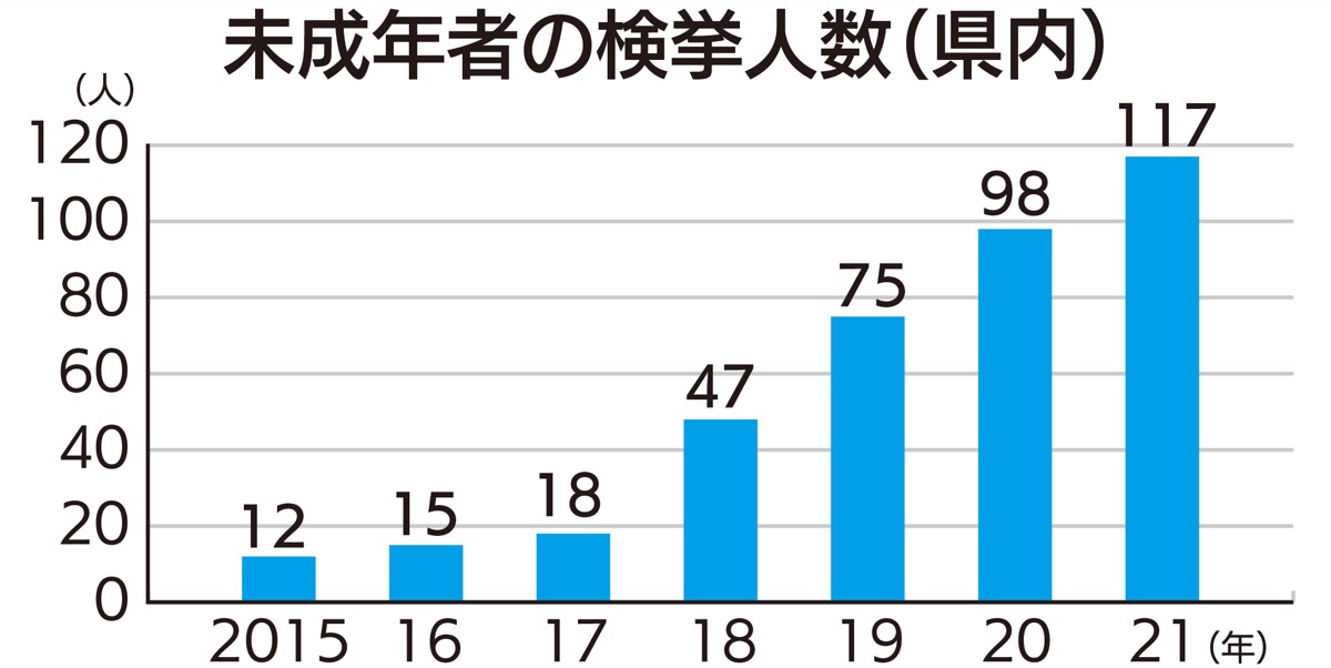 大麻所持などで検挙された県内の未成年者は2017年までは15件前後で推移していたが、18年に47件と急増。昨年は117件だった。覚せい剤やその他薬物は横ばいだが、大麻だけが増え続けている。