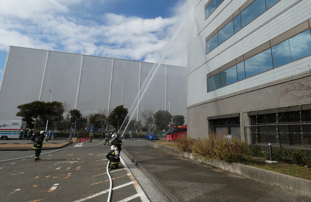 「春の火災予防運動」(3月1日から3月7日まで)を前に、臨港消防署(小川晶署長)は公益社団法人川崎港振興協会との合同訓練を2月24日、川崎区東扇島の川崎マリエン(川崎市港湾振興会館)で実施した。