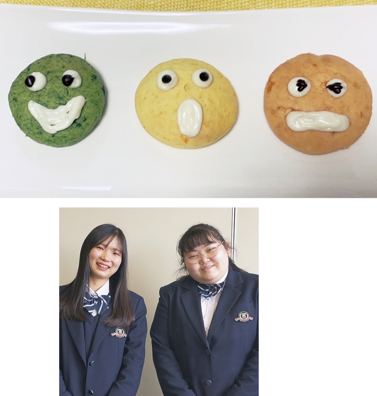 同作品を考案したのは原谷ひかりさん、山崎咲良さん、竹澤日芽さんの3人。商品開発の授業の一環で応募した。川崎にちなんだ作品をと、市の交通安全のキャラクター「かわさきしんごくん」をモチーフに3色のクッキーを制作。赤はトマトペースト、黄色はニンジン、緑はホウレンソウで色を表現した。水分の多いトマトをペーストにする点と、チョコペンで顔の表情を描く点で苦労したという。