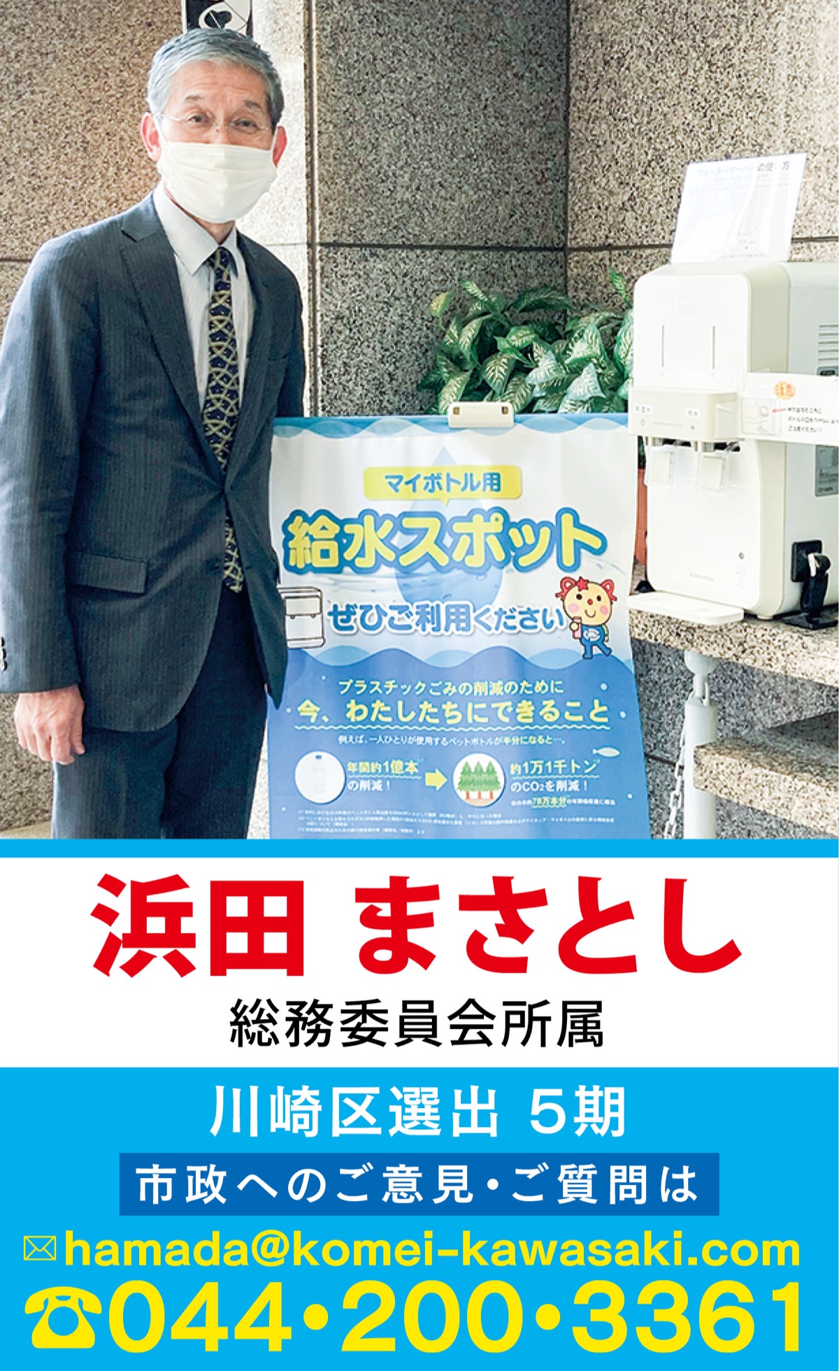 環境局長は「昨年4月から29カ所にウォーターサーバーを導入し、10カ月間で500ミリリットルのペットボトル10万本分の削減ができました。ウォーターサーバー設置は、環境教育にもなり、脱炭素社会へ向けて有効です」と前向きな答弁をしました。