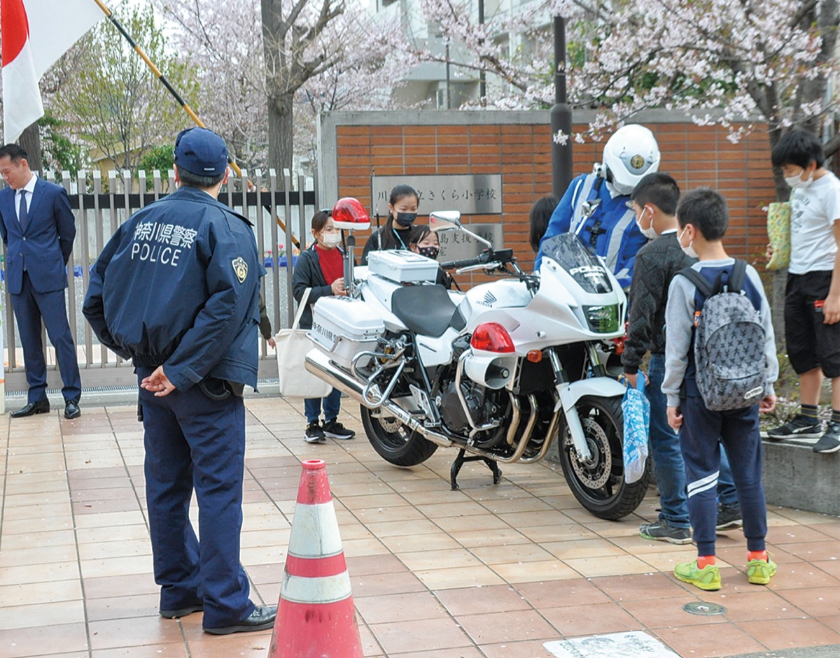 市内の小学校で入学式が行われた4月6日、川崎臨港警察署(仲戸川博幸署長)は管轄エリア内の5小学校の校門前で見守り活動を実施。署員らが登校する児童や父母らに「おめでとうございます」と声をかけていた。