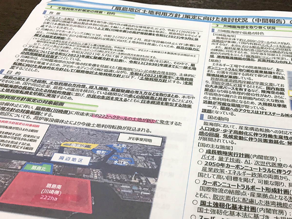 2023年9月に高炉が休止される川崎区扇島のJFEスチール東日本製鉄所京浜地区の跡地利用について、川崎市は4月21日、検討方針の中間報告を公表した。「地球温暖化の進行」「産業構造の転換」を解決するフィールドと位置づけ、災害時の拠点としての役割も明記された。市は30年度には一部の土地の利用を開始するとしている。