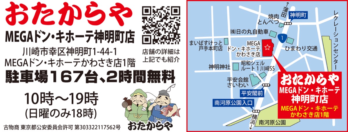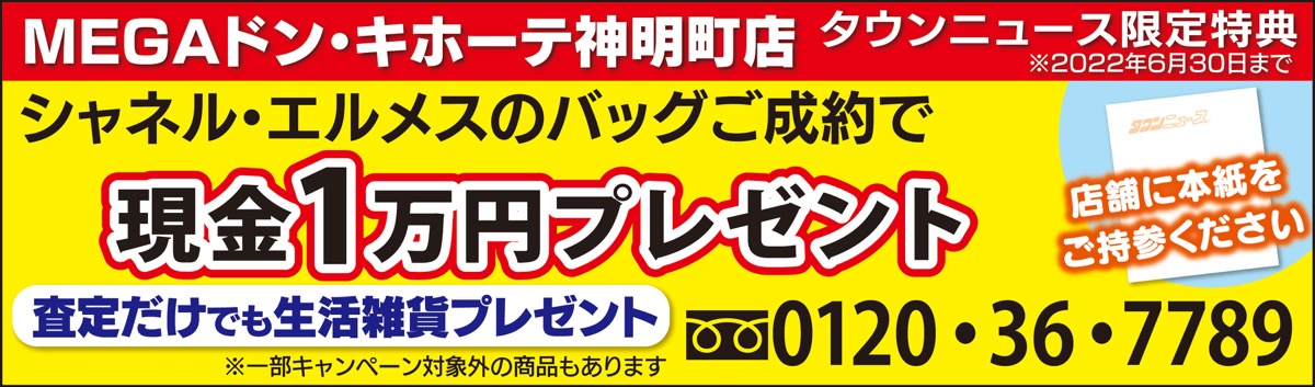 国道1号線沿いのディスカウントストア「MEGAドン・キホーテかわさき店」1階の買取専門店「おたからや」では、6月末までシャネル・エルメスの買取を強化中。バッグの買取成約で現金1万円を進呈しており、スタッフは「古くても壊れていても大丈夫です。この機会にぜひご相談ください」と話す。