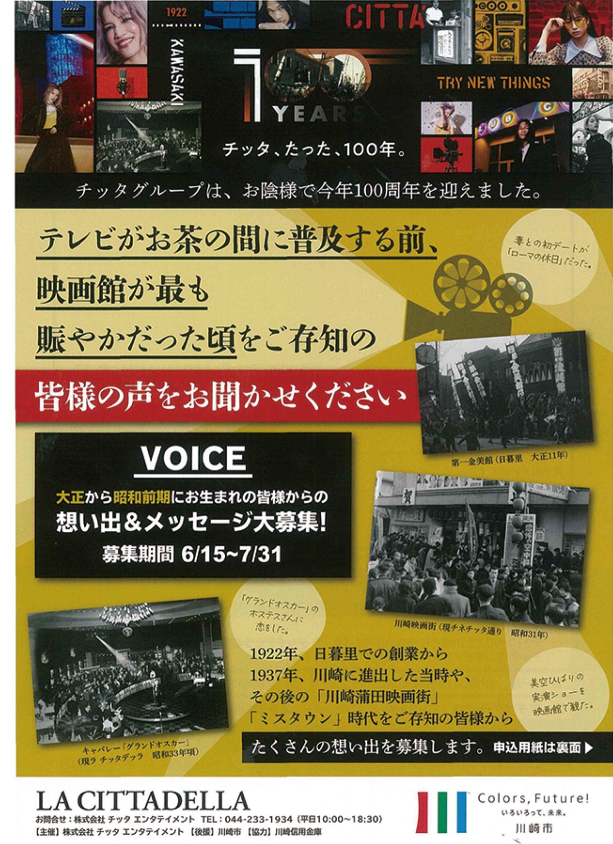 1922年に日暮里で創業した当時や、37年に川崎に進出した頃、その後の「川崎蒲田映画街」「ミスタウン」を知っている人からの想い出を聞きたいという。