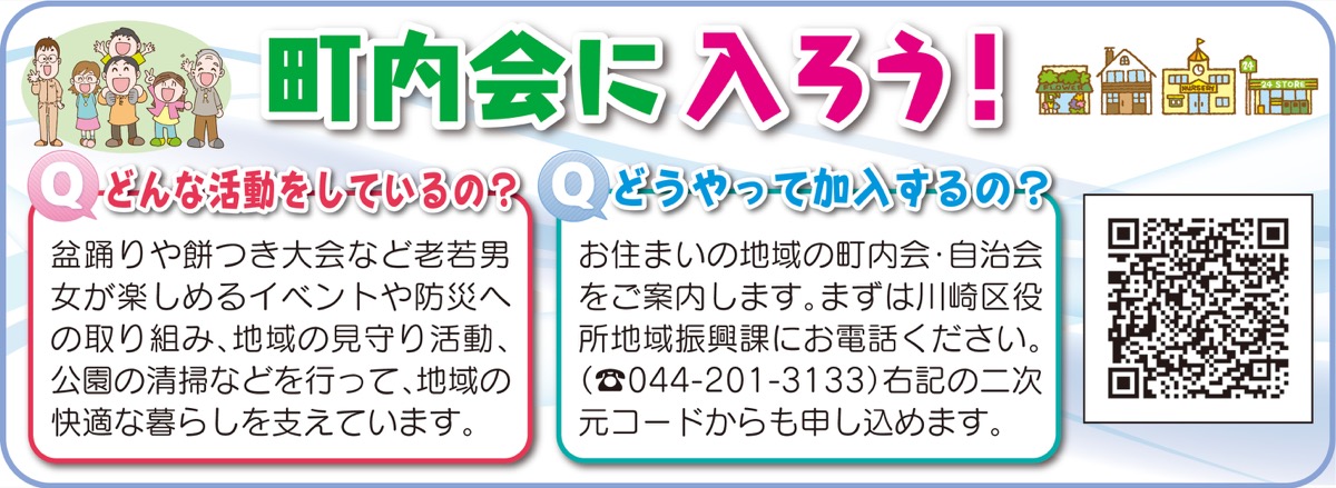 町内会・自治会は、地域で行われる様々なスポーツ活動にも間接的な関わりを持つ。川崎区で盛んに行われているソフトボール大会やバレーボール大会、パワフルかわさき区民綱引き大会などは「川崎市スポーツ推進委員」が運営を下支えする。このスポーツ推進委員は各町内会・自治会長からの推薦を受けて選出。市全体で450人の定数のうち、川崎区には68人が名を連ねる。任期は2年で運営以外にも実技の指導や教育機関、行政機関、スポーツ関係団体が行うスポーツ行事への協力などの職務に従事。川崎区民の体力を測定する「体力テスト会」や「かわさき多摩川マラソン」の運営協力も重要な活動の一つだ。