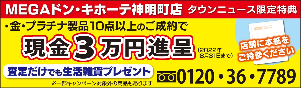 ディスカウントストア「MEGAドン・キホーテかわさき店」1階の買取専門店「おたからや」では、8月末まで金・プラチナ製品10点以上の買取成約で、買取金額とは別に現金3万円を進呈している。スタッフは「使わずに自宅で眠ったアクセサリーなどはありませんか。ぜひ気軽にご相談ください。査定だけでも大歓迎です」と話す。