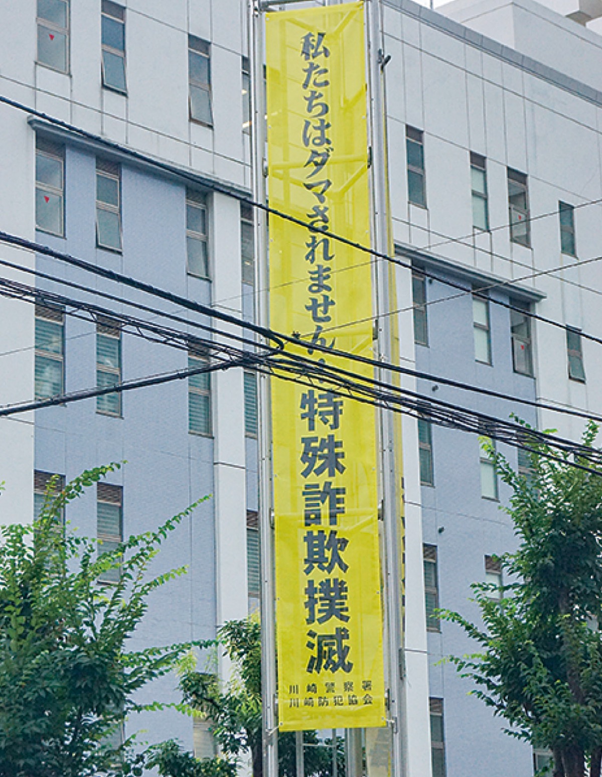 川崎警察署入口前に8月4日、特殊詐欺被害防止対策のスローガン「私たちはダマされません!」を記した懸垂幕が掲げられた。同日、川崎防犯協会(荒金嘉昭会長)が寄贈をした。