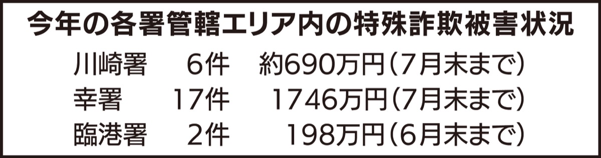 高齢者を狙った悪質な特殊詐欺の被害が後を絶たない。神奈川県内では今年に入り、被害が急増。6月末時点で833件(昨年同時期230件増)、被害金額は16億3600万円(同6億600万円増)にのぼる。川崎区・幸区内では被害こそ減っているが、詐欺グループからのだましの電話(アポ電)は毎日のように鳴り続けている。