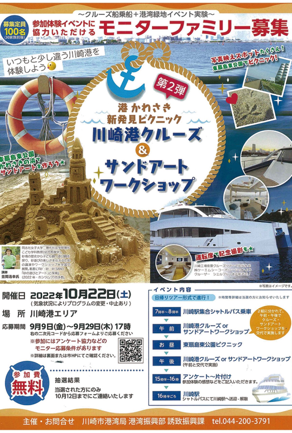 川崎市港湾局は川崎港の魅力向上に向けて、クルーズ船と港湾緑地を活用したイベント実験を行う。現在、体験イベントに参加できる家族モニターを募集している。