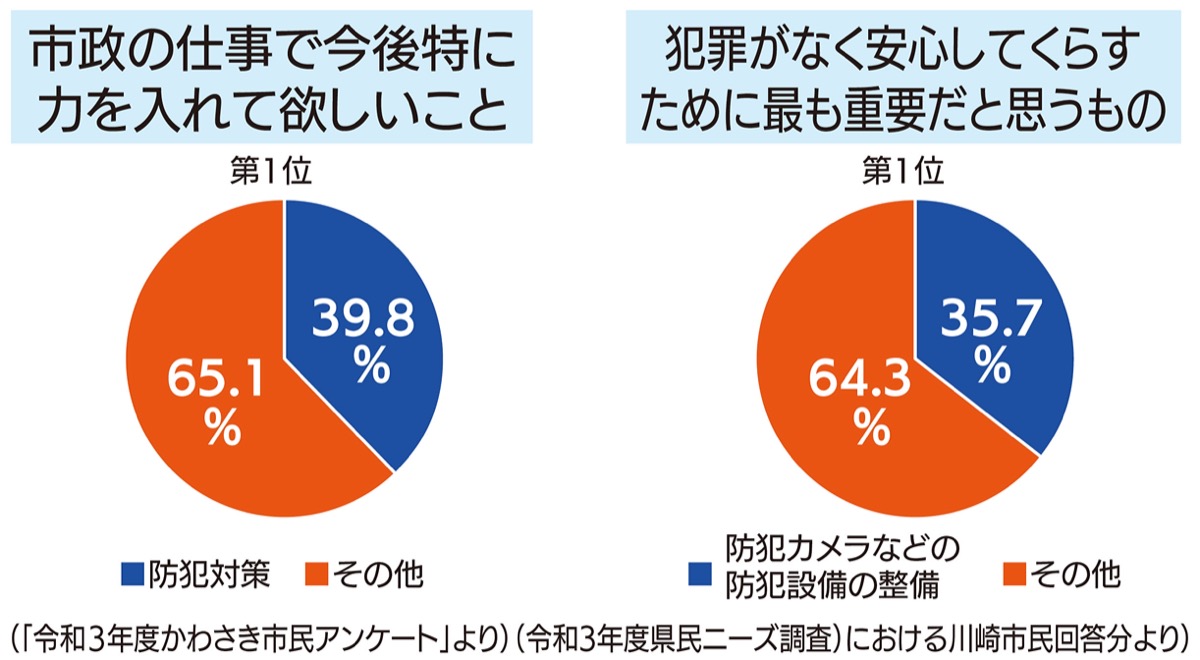 しかし、この方法だけでは、設置への需要や効果的かつ効率的な整備は困難です。その一つの根拠として、神奈川県警が発表した平成28年から平成30年の過去3年間の刑法犯認知件数は、川崎区が6896件、幸区が3266件、中原区が4371件、高津区が3196件、多摩区が3290件、宮前区2391件、麻生区が1733件であるのに対して、同じく過去3年間の区別の防犯カメラ設置実績は、川崎区が8台、幸区15台、中原区9台、高津区21台、多摩区33台、宮前区13台、麻生区23台となっており、刑法犯認知件数に対する防犯カメラ設置件数が見合っていない状況でした。