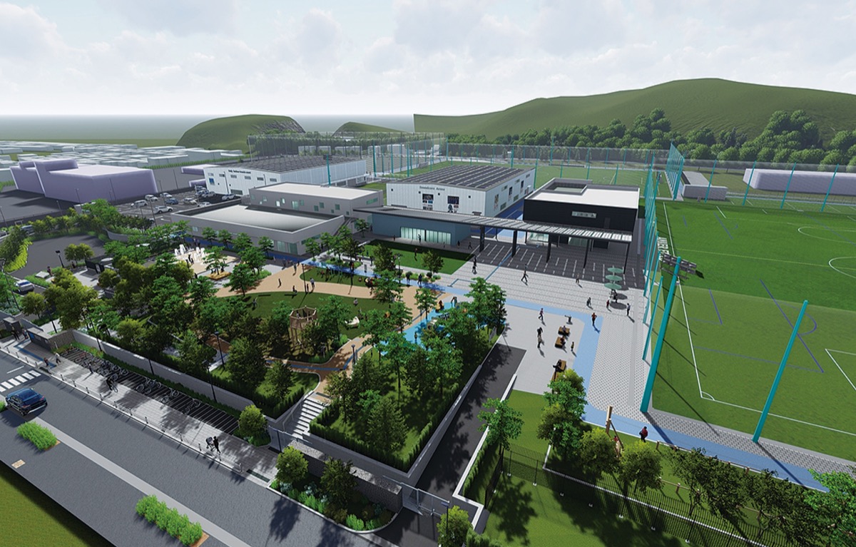 多世代の市民利用を想定しつつ、グラウンドは次世代の選手を育成するアカデミーの拠点に。スポーツ整形・リハビリ施設や保育学童施設も集まり、多目的広場等は災害時の一時避難所として活用される。同クラブ担当者の谷田部然輝さんは「工事は順調に進んでいる。いろんな用途に使ってほしい。市民の皆さんの健康づくりの場になれば」と思いを話す。