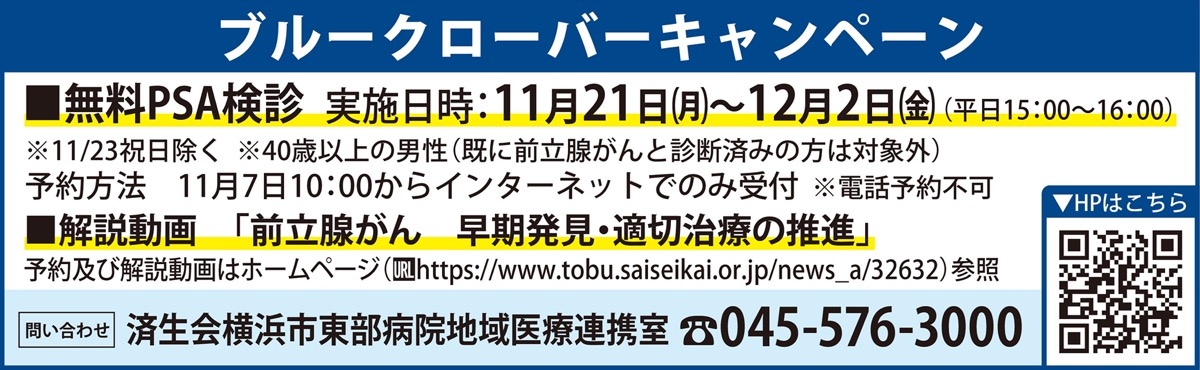 済生会横浜市東部病院=鶴見区下末吉=で11月7日から12月2日まで、前立腺がんの早期発見・治療を目的とする普及啓発企画「ブルークローバーキャンペーン」が行われる。11月21日からは無料のPSA検診(要事前予約)もある。
