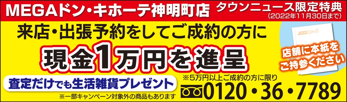 国道1号線沿いのディスカウントストア「MEGAドン・キホーテかわさき店」1階にある買取専門店「おたからや」では、11月末まで来店・出張予約をした人向けのキャンペーンを実施中。予約後の買取成約で買取金額と別に現金1万円をしており、スタッフは「どんな品物で査定しています。ぜひこの機会に、ご予約してご相談ください」と話す。
