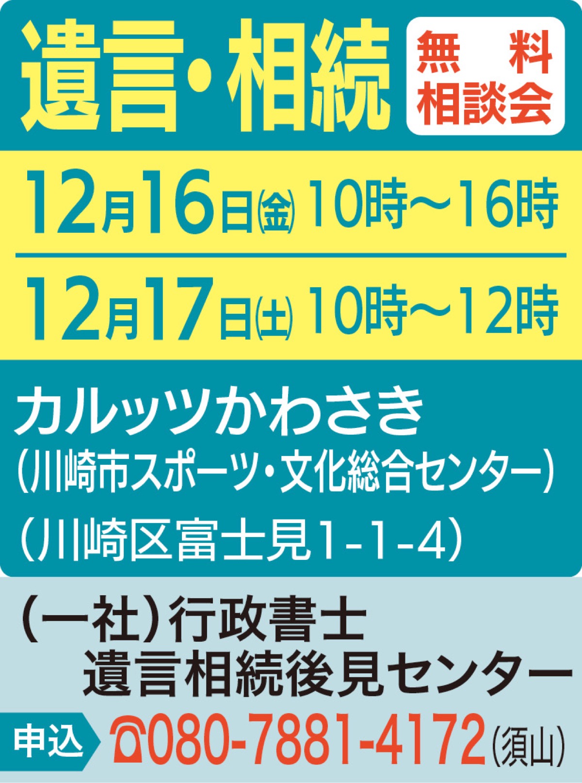 (一社)行政書士遺言相続後見センターが12月16日(金)(午前10時から午後4時/カルッツかわさき大会議室3)と17日(土)(午前10時から正午/同中会議室1)、第15回無料相談会を開催。予約優先、当日参加可。
