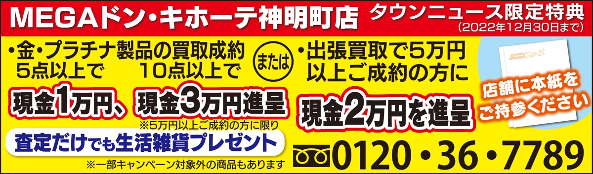 店舗改装が終了し、12月中は金・プラチナ製品の買取点数に応じて買取金額と別に現金を進呈する特典も。出張買取キャンペーンも引き続き実施中。出張費は無料で、自宅など指定の場所で査定に応じる。「12月中はまとめてのご相談がお得です。出張査定もぜひご活用を」とスタッフ。まずは気軽に電話予約を。