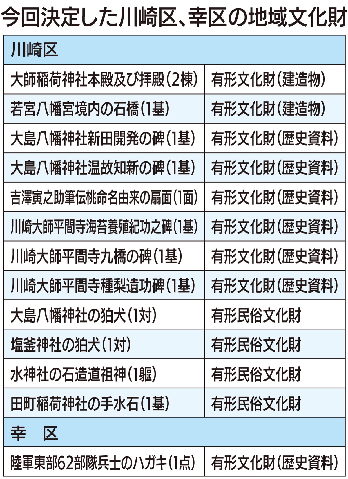 今回、川崎区で新たに決定されたのは大師稲荷神社(川崎区中瀬/中村博基宮司)の本殿及び拝殿、若宮八幡宮(川崎区大師駅前/中村博行宮司)境内の石橋などの建造物のほか、石碑が5件、神社の狛犬が2件、道祖神1件、手水石1件、扇1件の計12件。