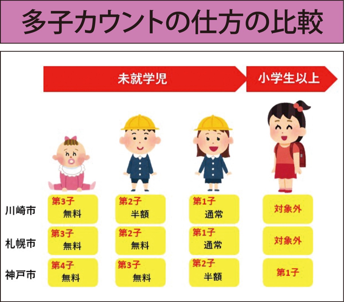 本市の保育料は第2子は半額、第3子以降は無料です。これは国の基準に基づき実施しているのですが、問題点は、一番上の子どもが小学生であると第1子とカウントされず、第3子が保育園に通っていても無料にならない所です。多子のカウントの仕方について政令市で独自の拡充を行っている事例もあり、札幌市は小学生はカウント対象外ですが、第2子以降の保育料は無料。世帯年収約640万円未満の場合は生計を一にする最年長の子どもを第1子とカウントし、第2子以降無料です。神戸市は18歳を超えた子どもも含め生計を一にしていたら第1子の年齢にかかわらず対象としてカウントし、第2子半額、第3子無料となります。これは多子世帯支援の充実度に繋がる重要なベースになります。