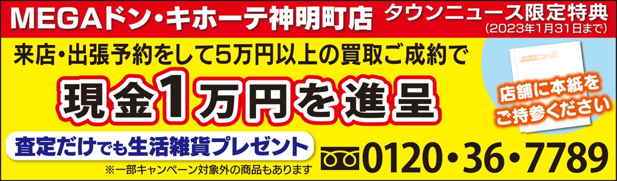 バッグやアクセサリーなどさまざまな品物の買取に応じる国道1号線沿いのディスカウントストア「MEGAドン・キホーテかわさき店」1階の買取専門店「おたからや」では現在、査定だけでも生活雑貨の福袋をプレゼントしている。スタッフは「まずは査定だけでも大歓迎ですので、気軽にご相談ください」と話す。
