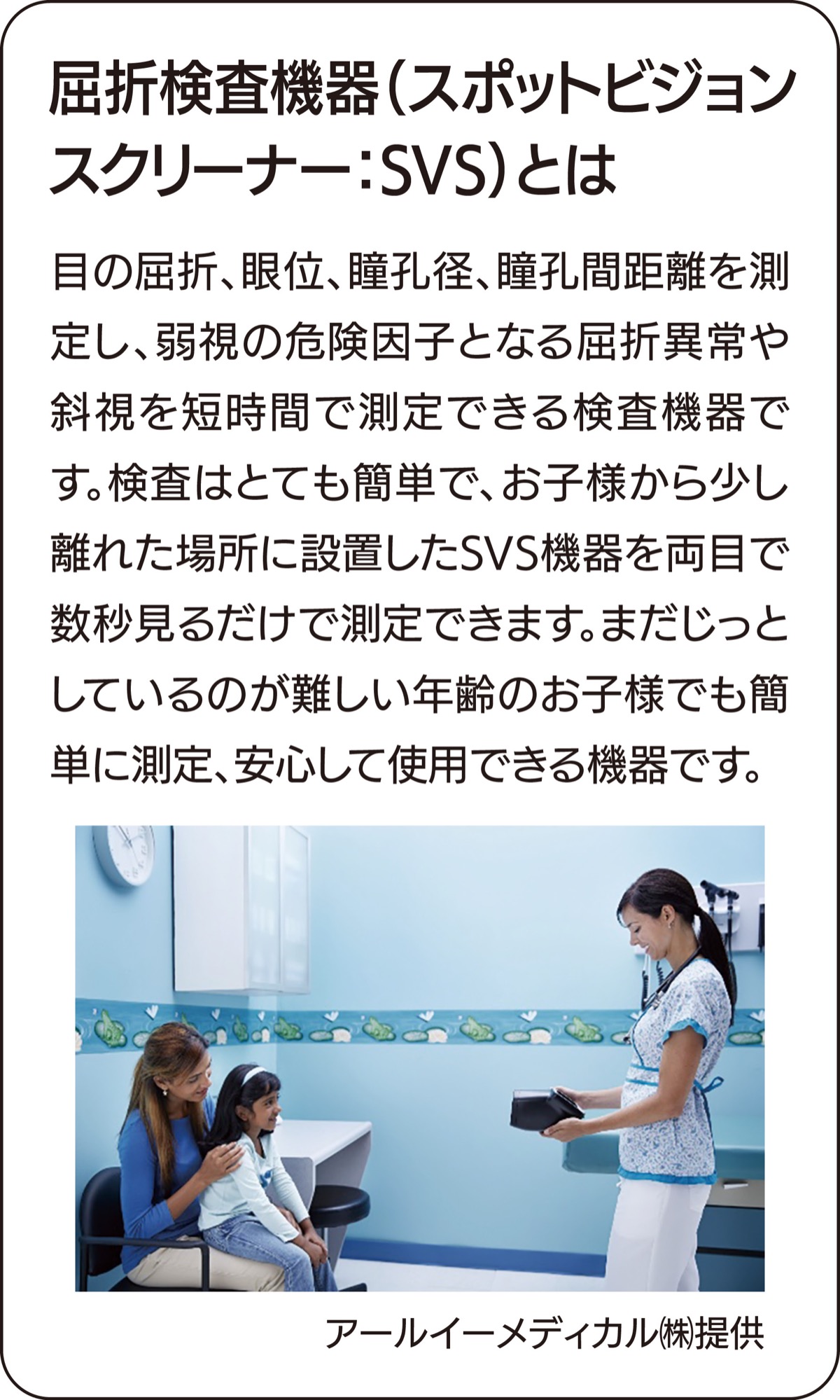 目の異常を早期に発見し適切な治療につなげるため、従来は診査当日に提出する調査票をご家庭で記入、加えてご家庭で検査を実施し、3歳児健診受付時にその調査票を回収し、2次検査が必要なお子様は後日検査を実施していましたが、新たに屈折検査機器の導入により健診当日に精度の増した検査が可能となりました。