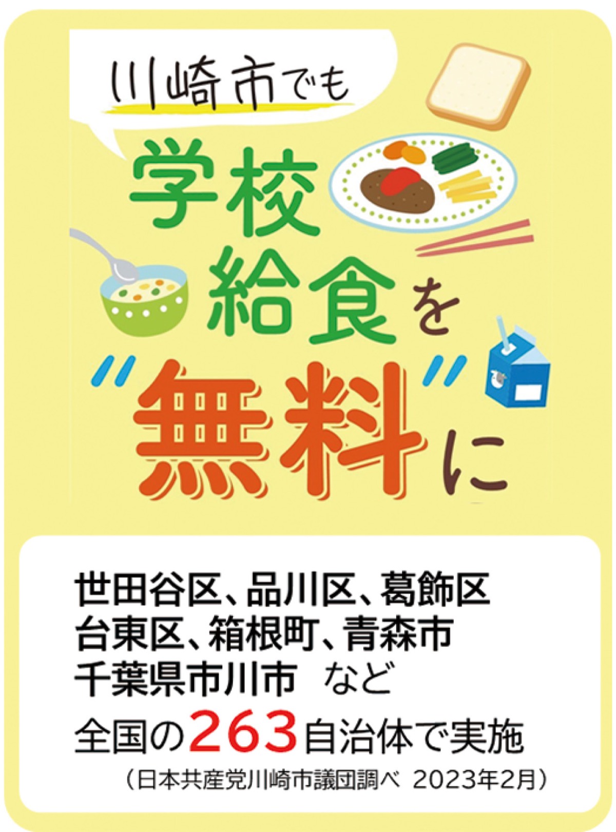 日本共産党市議団はこうした観点から「学校給食費を無償に」と求めてきましたが、川崎市は「無償にするのは義務ではない」などといって拒否。国会で首相も「自治体ごとに判断するべき」と述べており、東京では世田谷区や品川区など8区で、全国では263自治体が給食費を無償化しています。川崎市が「やる気」になればすぐにできるのです。