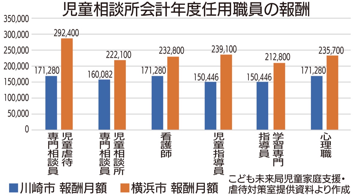 特に、会計年度任用職員(4月1日から翌年3月31日まで)の配置不足は深刻です。先日、児童相談所の募集案内を見た方から「報酬が低く、これではなり手がいないですよ」との声をいただきました。報酬月額について横浜市との比較調査をしてみると児童相談所相談員の月収は川崎市が16万82円〜16万8155円に対して横浜市は22万2100円です。また、看護師では、川崎市が17万1280円〜17万9354円に対して、横浜市は23万2800円となっていました。