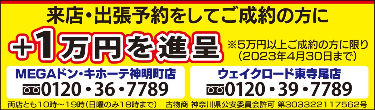 ブランド品や貴金属をはじめ、どんな品物でも査定に応じている同店。予約後の買取成約で、買取金額と別で現金1万円を進呈している。スタッフは「使わなくなったアクセサリーなどはありませんか。まずは査定だけでも構いませんので、気軽にご相談ください」と話す。