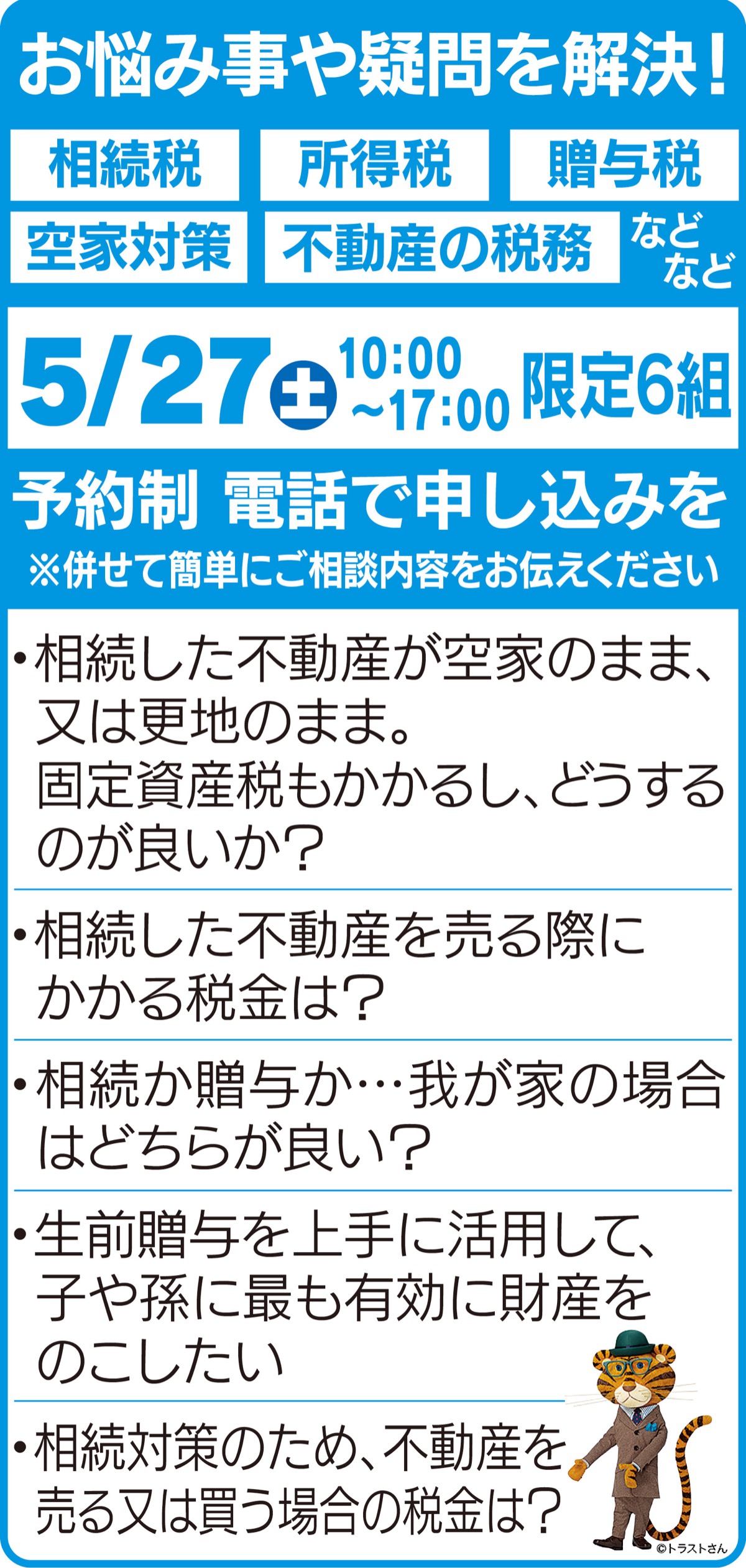 「我が家に相続税はかかるのか」「不動産の売却や住み替えにまつわる税金や特例について知りたい」「相続した不動産はどうすればいいか」など1組60分、我が家の場合での相談が可能。限定6組で予約制(先着順受付)。「毎回ご好評をいただいておりますので、ご予約はお早目にお電話下さい」と担当者。予約・問合せは左記へ。