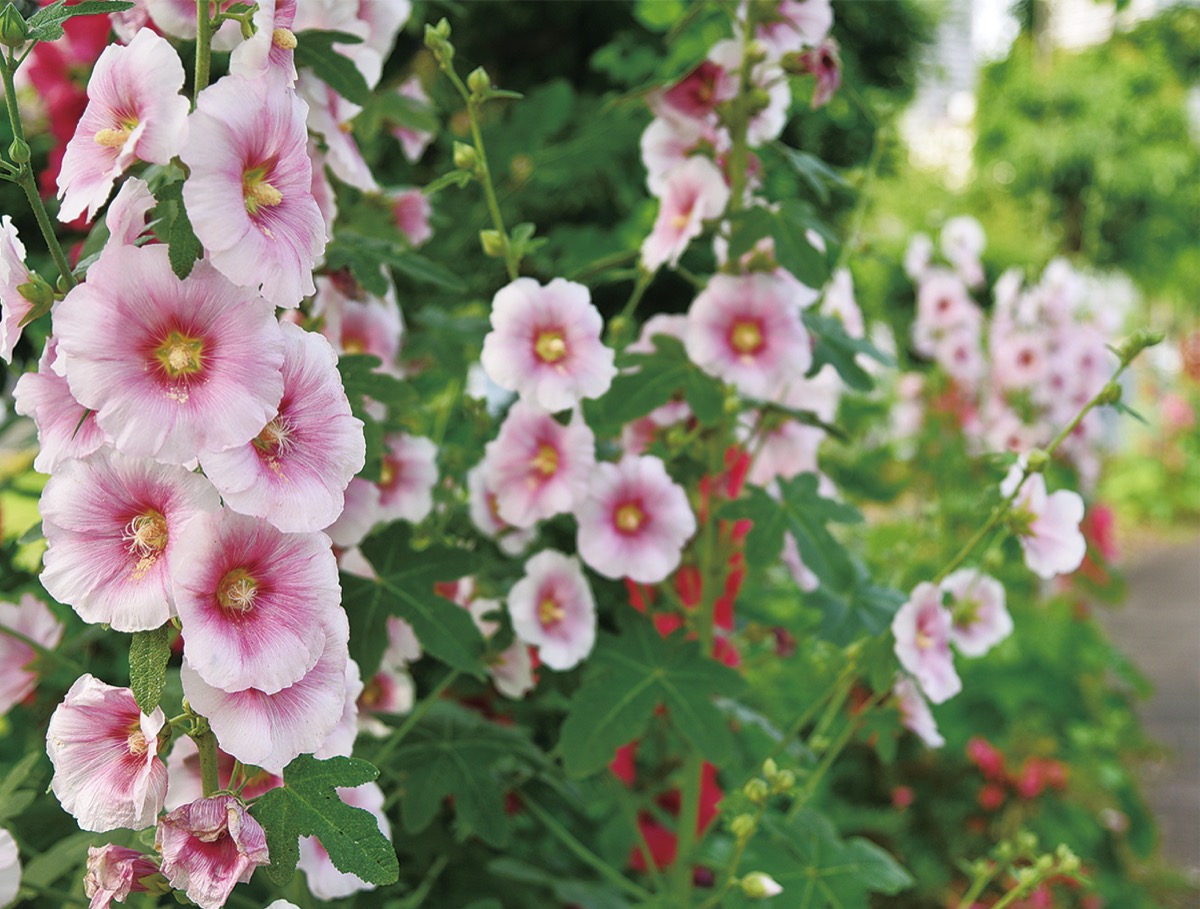 空に向かって真っすぐに伸びるタチアオイ。ふれあい公園の一角には、歩道沿いに咲く赤やピンクなど色鮮やかな花が訪れた人の目を楽しませている。