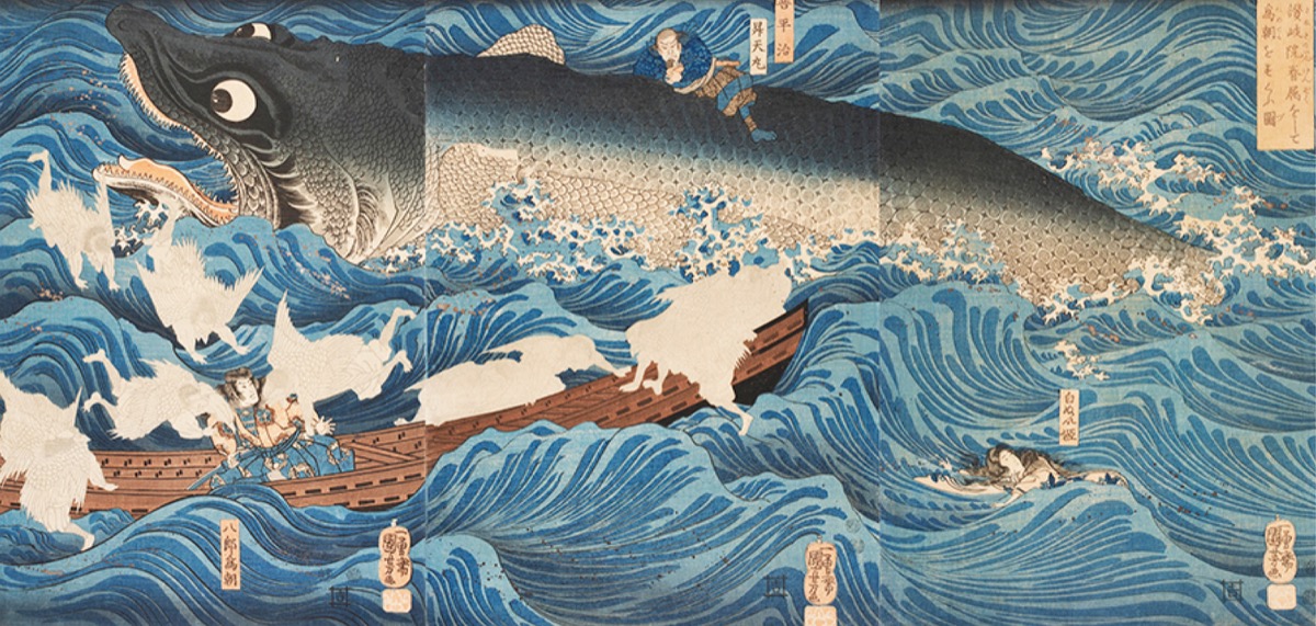展示される、歌川国芳『讃岐院眷属をして為朝をすくふ図』は、曲亭馬琴の読本『椿説弓張月』を題材にしている。平時討伐へ向かう船が嵐に見舞われ、海に投げ出されてしまった昇天丸と喜平次。自害しようとする源為のもとに讃岐院の眷属である鳥天狗たちが現れて源為を救い、源為の忠臣が宿る大鰐鮫が昇天丸と喜平次を救った。横長の画面を貫くように巨大な鰐鮫を表し、讃岐院の霊が呼び寄せた異界の鳥天狗たちは、薄墨の線のみで描かれている。