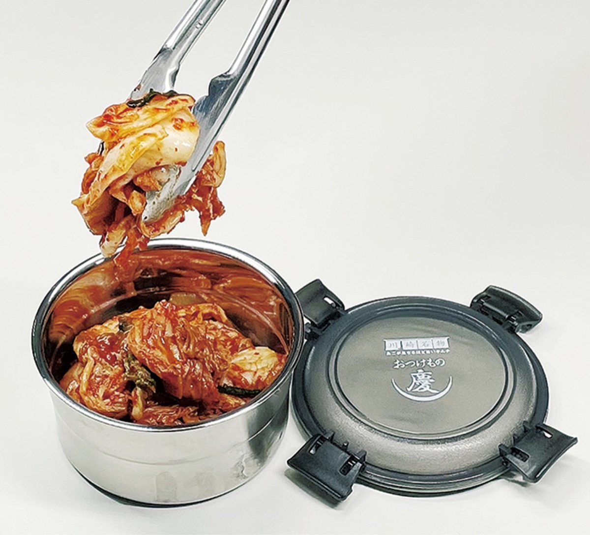K-potは、ステンレスで造られ、マット感のあるフタの中央部分には、「おつけもの慶」のロゴが施されてある。密閉性に優れ、液漏れや臭いの心配がないのが特徴。購入者は増加しているという。