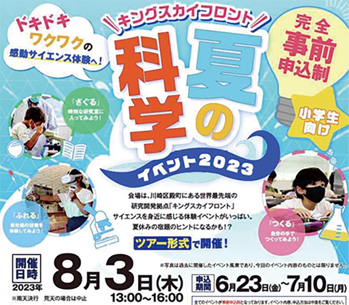 川崎市は小学生を対象とした「キングスカイフロント 夏の科学イベント2023」を8月3日(木)、午後1時から4時まで開催する。場所は、川崎区殿町にある研究開発拠点「キングスカイフロント」。