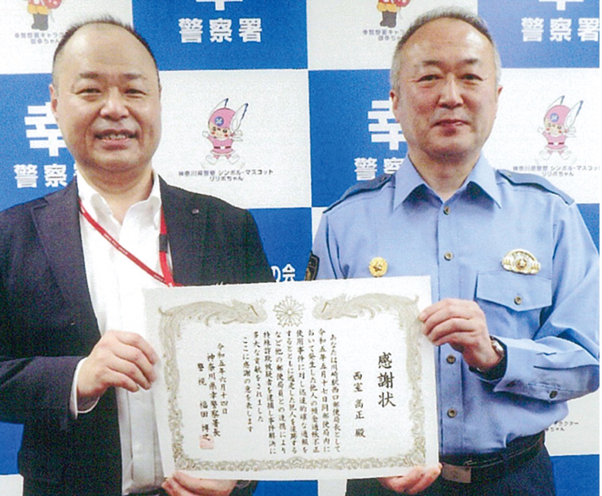 川崎駅西口郵便局の西室高正局長に6月14日、 窃盗未遂事件をおこした犯人の逮捕に協力したと幸警察署(福田博之署長)から感謝状が贈られた。