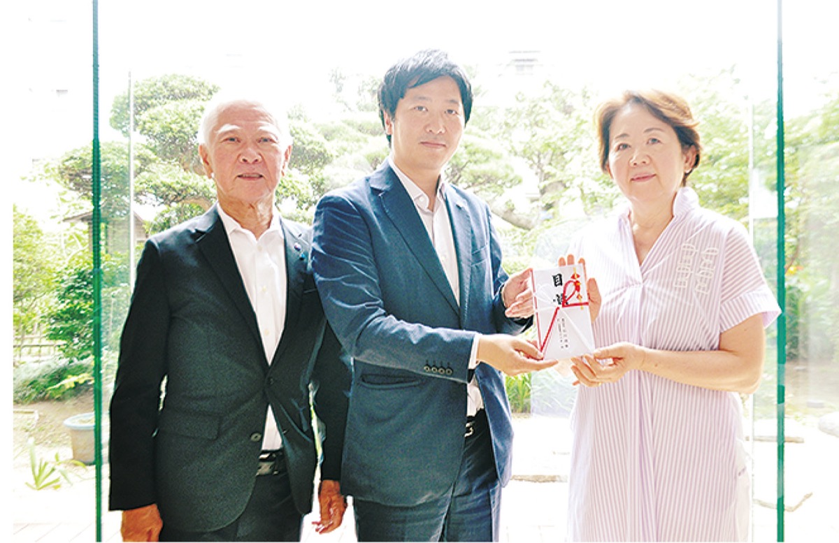 不動産賃貸管理を営む石川商事(本店/川崎区東門前)は7月13日、地域貢献の一環として、特別養護老人ホーム「ゆとりあ」(川崎区殿町/寺尾富美代理事長)に現金50万円を寄付した。受け取った寺尾理事長は「老朽化している設備の買い替えなどに使いたい」と感謝を述べた。