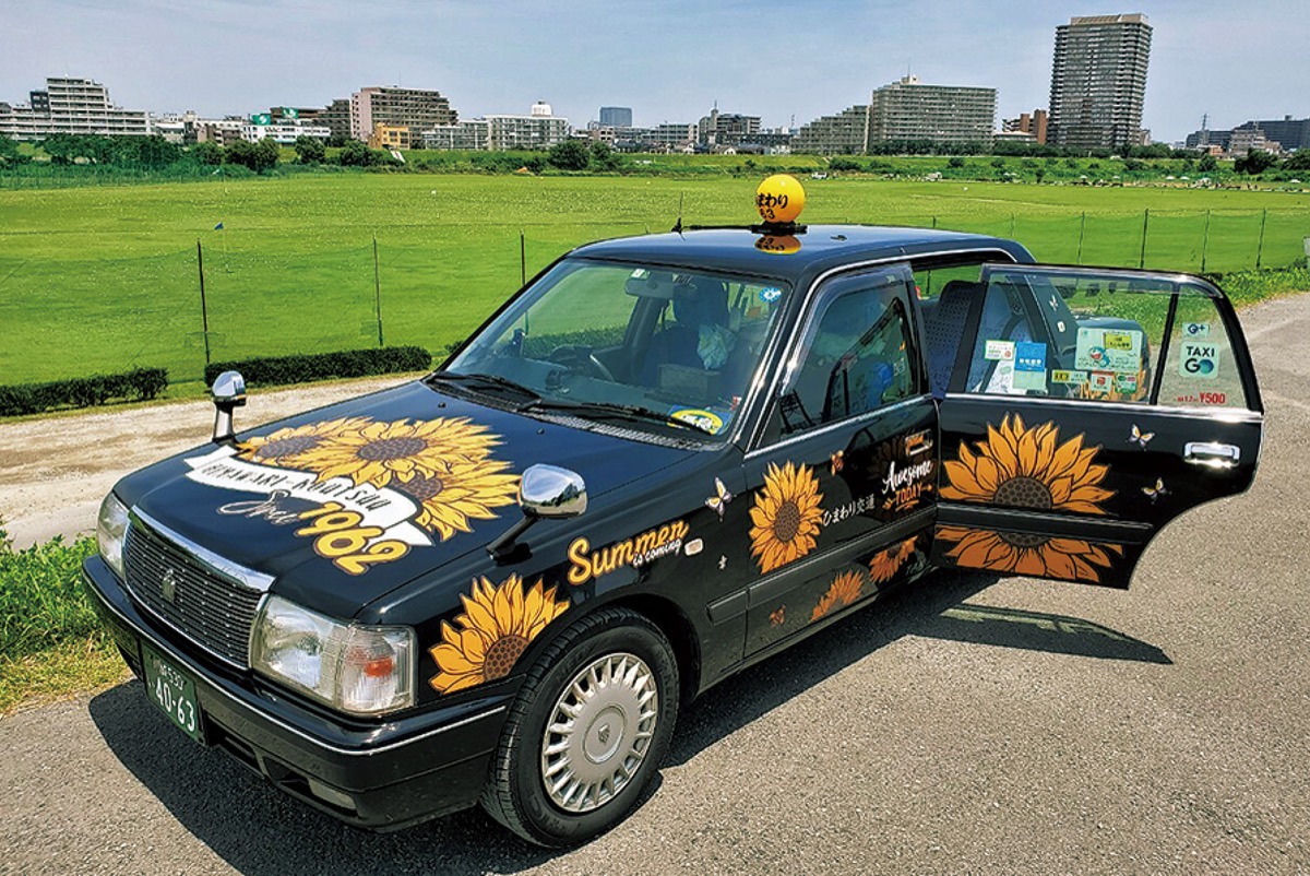「ひまわり交通」(幸区神明町・村木緑代表取締役)はひまわりの花をデザインしたラッピングタクシーの運行を7月1日から始めた。
