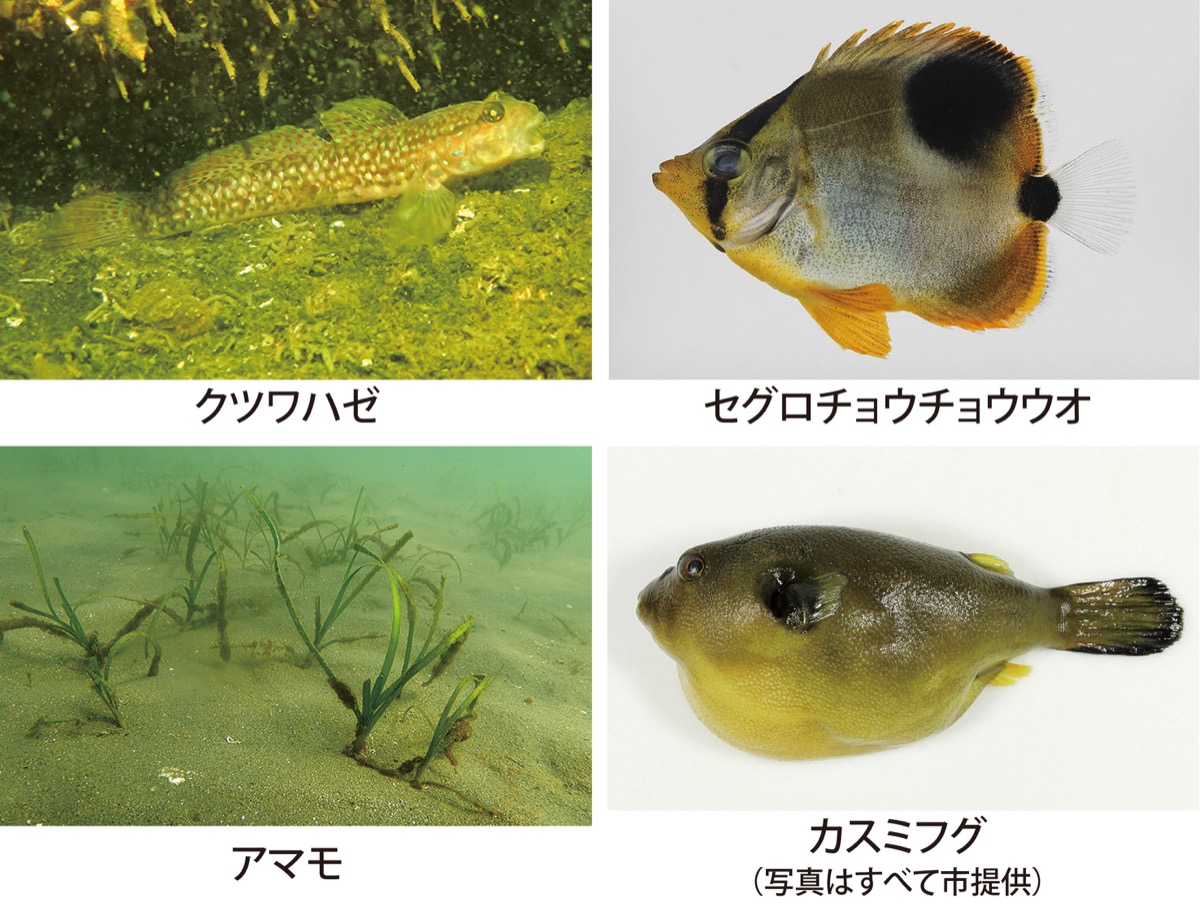 主に東京湾外洋に生息する「クツワハゼ」、東京湾より南方の暖かい海に生息する「セグロチョウチョウウオ」、「カスミフグ」が見つかった。市は「黒潮大蛇行により東京湾に黒潮が流れ込みやすくなっていることから、南方に生息する魚が北上してきた可能性が高い」と分析。東扇島公園の人工海浜(かわさきの浜)では、魚や貝などの産卵場や育成の場となるアマモの増加も確認されている。2023年1月から4月まで毎月100株程度のアマモを確認。毎月連続で確認されたのは、調査開始以来初めて。アマモの種子が外部から運ばれてきたことや水温・日射などが生育に適していたこと、水環境の改善が要因としている。