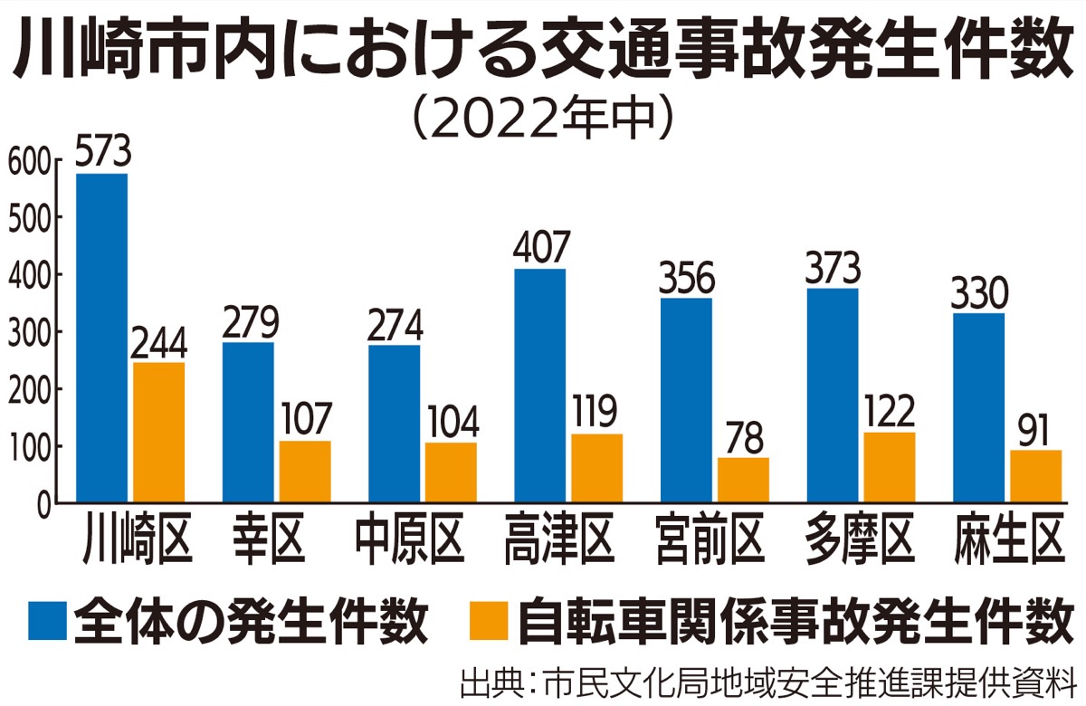 川崎市内で発生する交通事故のうち、自転車関係事故の割合は約30%超です。昨年、市内で発生した交通事故件数は2592件で、自転車関係事故は865件でした。区別の発生件数と構成率を見ると▽川崎区=244件(42・6%)▽幸区=107件(38・4%)▽中原区=104件(38%)▽高津区=119件(29・2%)▽宮前区=78件(21・9%)▽多摩区=122件(32・7%)▽麻生区=91件(27・6%)となっています。神奈川県は県内平均25・6%より3ポイント以上高い市区町村を「自転車交通事故多発地域」として指定。16地域のうち、市内は川崎区、幸区、中原区、高津区、多摩区の5区が指定されました。
