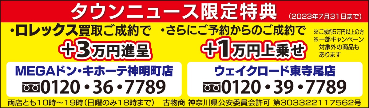 国道1号線沿いの買取専門店「おたからや」の2店舗は、腕時計・ロレックスの買取を強化している。7月末までの買取成約で、買取金額と別に現金3万円を進呈。予約後の成約なら、さらに1万円が上乗せされる。スタッフは「使っていない時計があれば、価値を確かめませんか。この機会にぜひご検討ください」と話す。