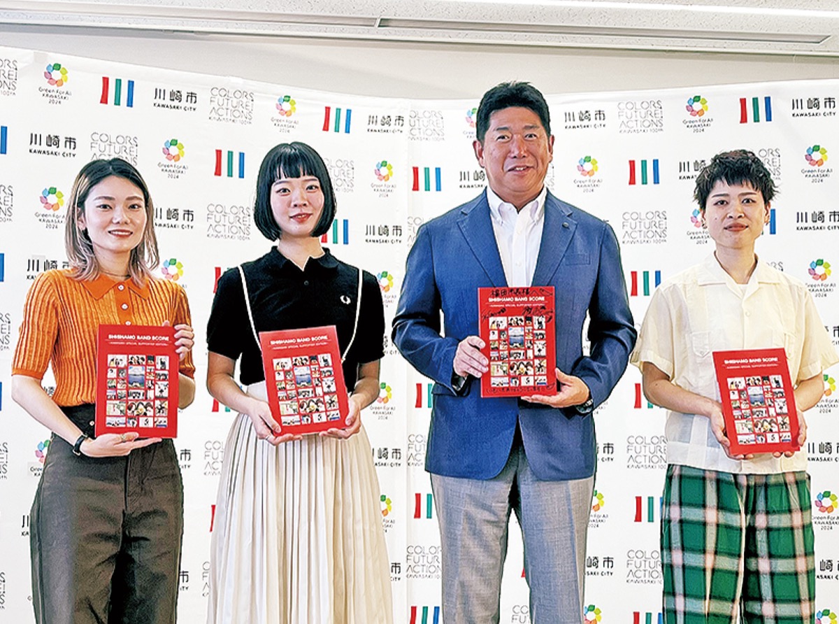 市立川崎総合科学高校(幸区小向仲野町)出身のスリーピースロックバンド・SHISHAMO(シシャモ)が市と協働でバンドスコア(楽譜)を制作し、7月28日に市内高校生に贈呈した。市制100周年企画の一環でメンバーの「若者を応援したい」との思いを形にした。