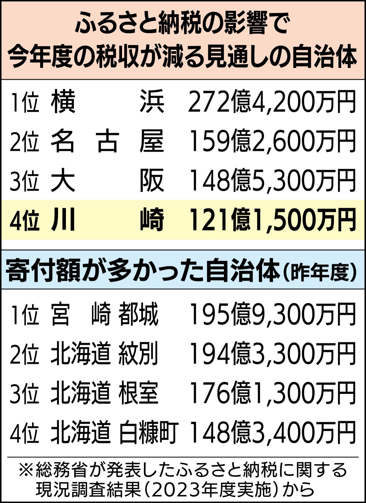 総務省は8月1日、ふるさと納税に関する現況調査結果を発表し、川崎市は今年度、121億1500万円の住民税が減る見通しを示した。税収減の規模は全国の自治体の中で4番目の大きさ。前年度比で18億2400万円増え過去最大ともなる。
