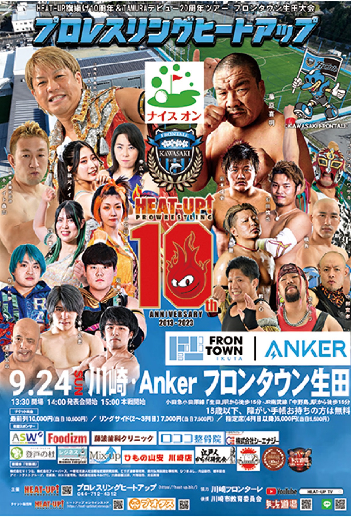多摩区に道場を構えるプロレス団体「HEAT-UP(ヒートアップ)」の「旗揚げ10周年&TAMURAデビュー20周年ツアー フロンタウン生田大会」がサッカーJ1・川崎フロンターレが運営するAnker フロンタウン生田(多摩区)で9月24日(日)に開催される。同クラブ協力、川崎市教育委員会後援。